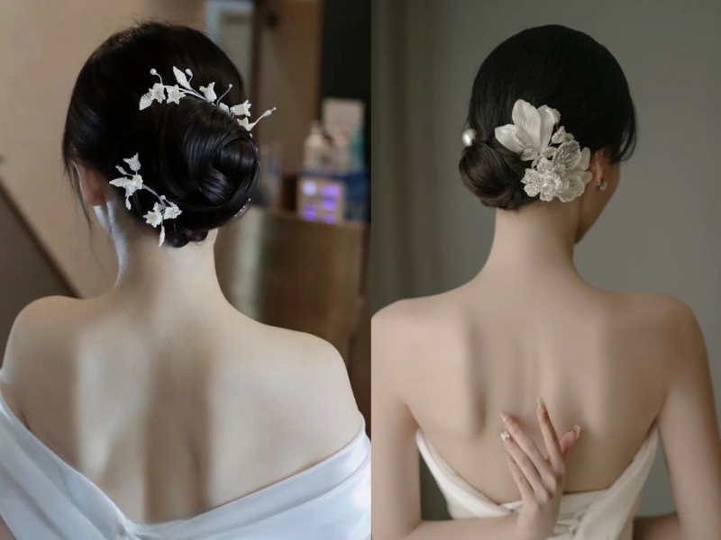Tóc búi thấp phù hợp với nhiều dáng váy từ ren cổ điển đến thiết kế tối giản hiện đại.