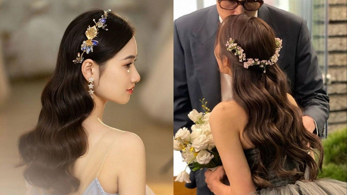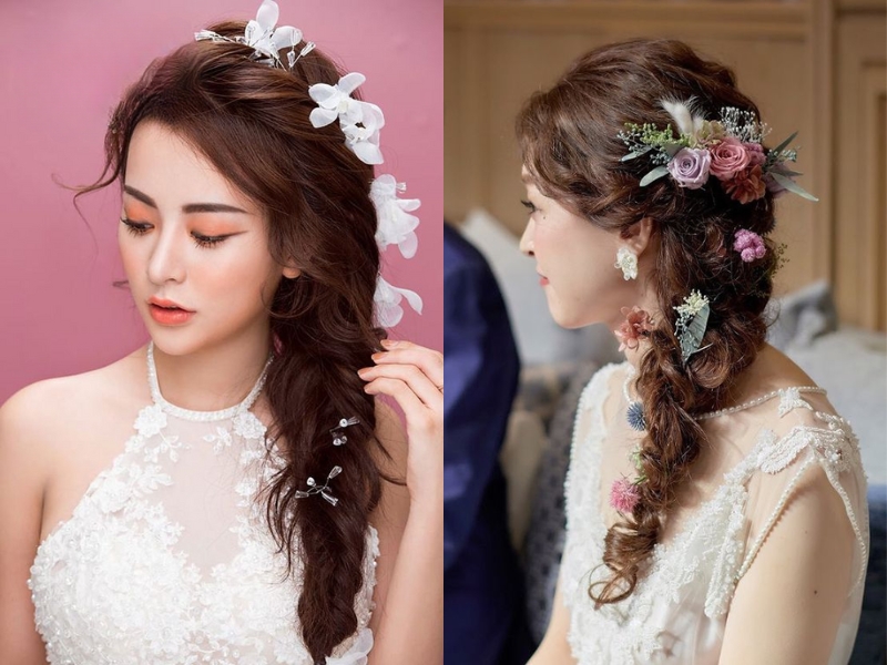 Khi kết hợp thêm hoa tươi hoặc ruy băng mảnh, kiểu tóc cô dâu này càng trở nên duyên dáng. Đây là lựa chọn lý tưởng cho tiệc cưới sân vườn hoặc phong cách boho nhẹ nhàng.