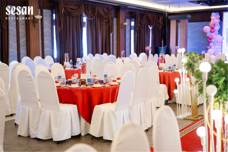 Sesan phù hợp với các buổi tiệc quy mô nhỏ dưới 200 khách, đặc biệt là lễ báo hỷ hoặc đính hôn. Không gian được thiết kế vừa đủ, tạo cảm giác gần gũi, riêng tư.