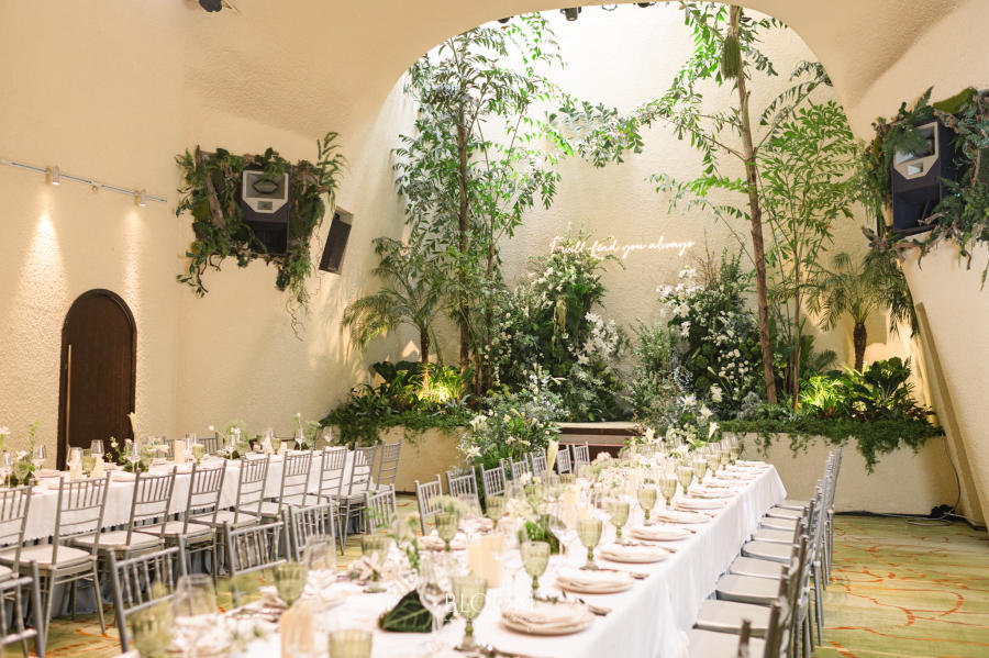 Sảnh Origami rộng lớn không cột cùng khu vườn xanh mát là điểm nhấn đặc biệt, giúp các cặp đôi dễ dàng tổ chức tiệc cưới trong nhà hoặc ngoài trời theo ý muốn.